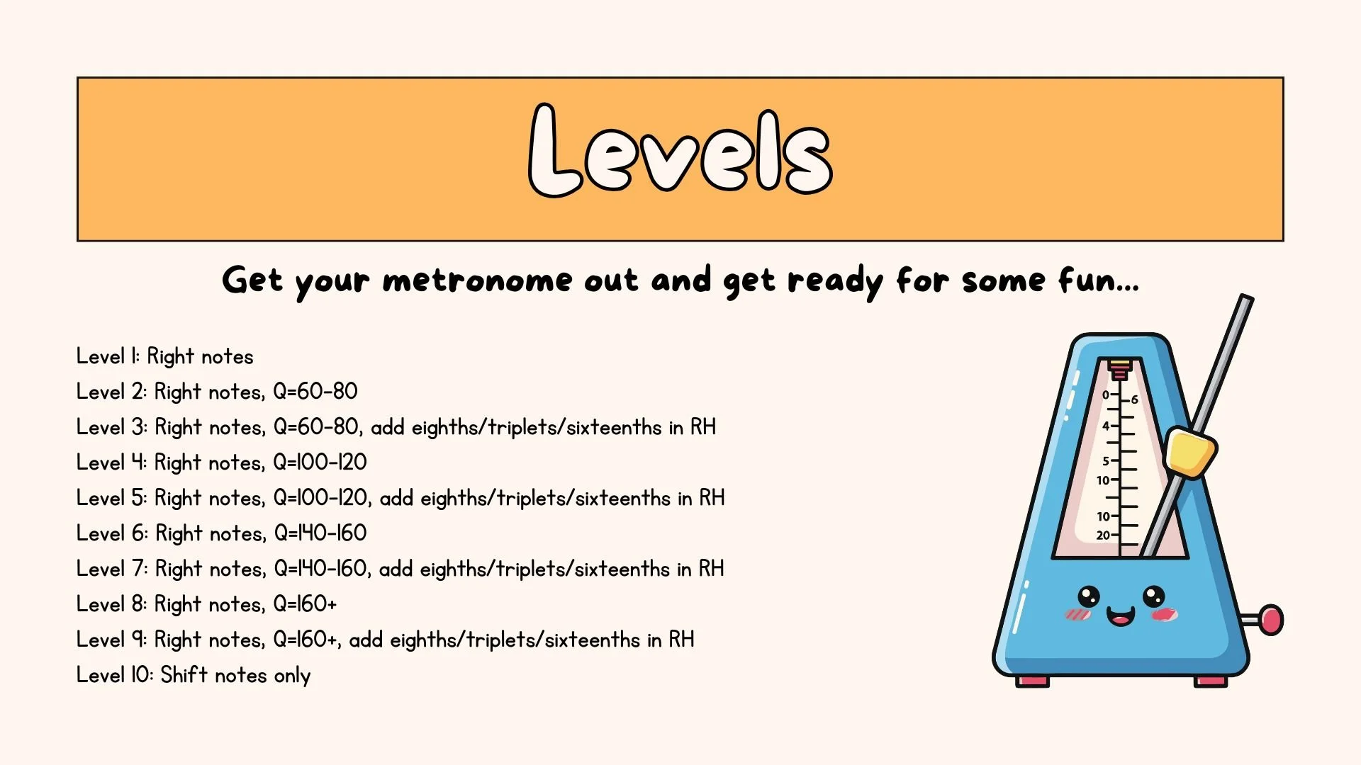Once someone is used to the finger pattern and can play it somewhat easily (this might happen over the course of days or weeks, depending on the player and the motivation level), it makes sense for me to help the player improve their scale. This will help deepen their knowledge of the scale without it feeling overwhelming. My favorite way right now to help players improve their scales is to help them drill them. We have been doing a lot of metronome drills this month, and ALL of my students who’ve been participating can’t help but keep wanting to level up.